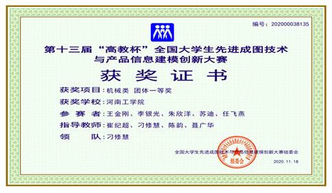 在2020年11月16日,由教育部高等学校工程图学教学指导委员会、中国图学学会制图技术专业委员会、中国图学学会产品信息建模专业委员会主办的第十三届“高教杯”全国大学生先进成图技术与产品信息建模创新大赛中,我校组织参赛的队伍荣获团体一等奖1项,个人一等奖2项、二等奖4项、三等奖1项的优异成绩,这是我校本赛项在取得国赛团体二等奖的基础上,又一次新的突破。