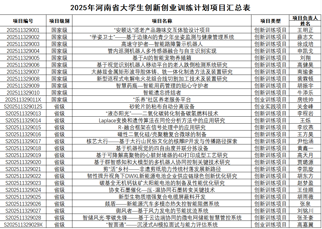 近日,河南省教育厅公布了《河南省教育厅办公室关于公布2025年大学生创新训练计划项目名单和结题验收结果的通知》教办高〔2025〕340号,我校再创佳绩,共获批国家级项目11项、省级项目18项,立项总数达29项,较以往实现大幅突破,创下我校在该计划项目中获批数量的历史最高纪录,充分彰显了我校在创新创业人才培养领域的显著成效。